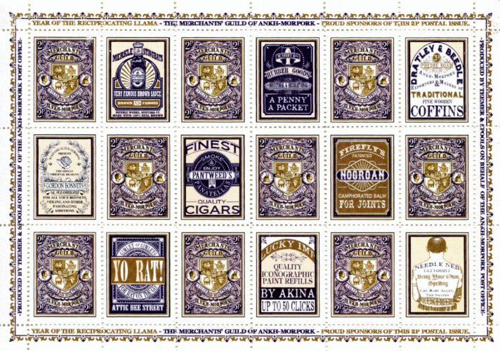 If you have not spotted the sport, it has the Patrician and Morporkia emblems reversed. While the design makes clear that this is Merchant Guild Stamp, I find this stamp just too over ornate and flowery. I would have preferred references to their trading activities, but you do get lashings of that from the advertising labels.