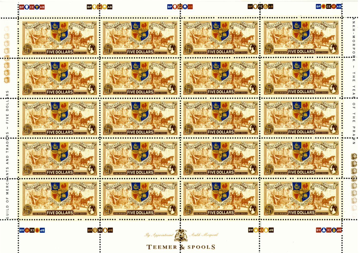 The $5 stamp was said to be sufficient postage to send a rather large package all the way to Genua, so in reality its function was less to do as a postage stamp as a promissory note against Guild funds, just like that tenner in your wallet or purse. Remember that until Mr. Lipwig was appointed Master of the Royal Mint Ankh-Morpork lacked paper money, and larger sums of money in the form of coins are bulky and heavy. The use of stamps in this way was mentioned in both Going Postal and Making Money. It has been said that some stamps change hands over six times before getting a glimpse of an envelope. This stamp was previewed as a prize for winners who came up with a good taste for flavoured stamp gum, in the form of a special proof sheet.