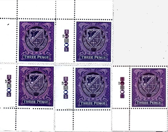 The Assassins Guild Three Pence, otherwise known as the Thrup`ny Resurrection. This essentially the same stamp as the Postage Paid, but with that text replaced by Three Pence, following up Sir Terrys vision of the stamp. They were still printed in sheets of 28, and these were available to collectors. The sheet margins have minimal decoration, although part of the BP-AB-CE logo is the word GUM. This may have been a gentle reminder to the Emporium because of what happened initially. The Ungummed Thrup`ny occurred on the first batch of sheets when the incorrect paper was used. It is said that 1500 such stamps were produced and those that went to collectors were found in LBEs. If my theory is correct, there would be two slightly different sheets of these stamps; one with, and one without the GUM wording. Those without though may have all been split up and no intact examples exist. Or was the GUM bit always there? Placed as a reminder that these were destined to become Skullbacks, but never happened. The Postage Paid stamp sheets are unlikely to have had the logo.