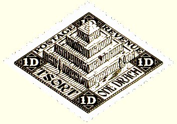Two stamps from Tsort remind collectors of the history of the nation. The ˝ Drachma stamp features the Wooden Horse of Tsort, used during the wars against Ephebe - or was it Ephebe that tricked the Tsortians? They were locally printed in sheets of 24 with a sport which gives the game away. The 1 Drachma stamp is a first Discworld. Not only is it rhomboid in shape, but its artwork gives the impreession of 3Dness. This pyramid, you will remember, is where the prophecy that Discworld would come to a sticky was written, unless the 7+1 spells were spoken. The sport for this stamp proudly announces that it is valid for postage in TSPORT!