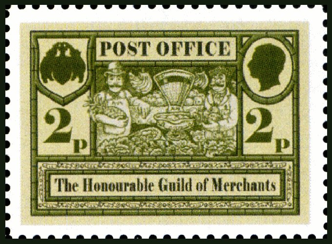 Greengrocers Two Pence A branch of the Guild omitted from the original issue is corrected by this stamp issued when Mr Antimony Parker became the guild Grand Master. The illustration by Jane Debny is this artist’s only contribution to the DW stamp repertoire (though she provided artwork the Puck of Pooks Hill stamp). Personally I think she missed a trick by not using the ‘greengrocer’s apostrophe’. For some reason there was nor sport of this stamp. Very ornately the sheet informed us that, instead of Teemer and Spools the AMPO used Cripslock (perhaps for the first time) at the Street of the Cunning Artificers for the printing of this stamp.