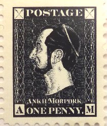 Released in 2005, and linked with The Monstrous Regiment (the theme for the Clarecraft event at which they were launched) was the first Discworld Stamp booklet. It contained a pane of six Military Penny Patricians. The intent being that the boys on the front line in the skirmish between Borogravia and Zlobenia get mail from loved ones back home. At least the Ankh-Morpork contingent were boys!