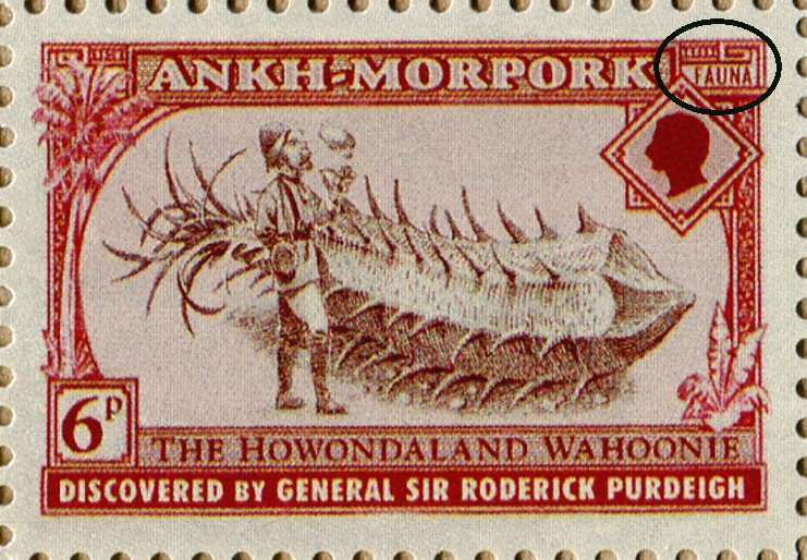 Why does the stamp text say FAUNA when the Wahoonie is of vegetable origin? This has been asked on the forum, but no answer was given. Moving Pictures makes the Wahoonie’s status clear. ‘They put stickers on the back of their carts saying “Ankh-Morpork - Loathe it or Leave it”. They call it The Big Wahoonie after the fruit’. In the footnotes the Wahoonie is described as ‘ .. twenty feet long, covered in spikes, the colour of earwax, and smells like an anteater that’s eaten a very bad ant’. Its RW equivalent would be the Durian. So definitely FLORA would have been more appropriate.