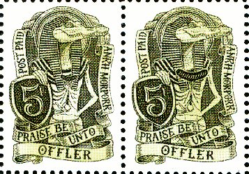 The Year of the Incontrovertible Skunk saw a short series of God stamps re-imagining three that had gone before; namely Anoia, Offler and Blind Io. Previously they had appeared on widely differing stamp designs, but now they comprosed a proper set; presumably so that Ankh-Morporkians could post a letter with their chosen deity on the stamp. The appeared singly on three successive LBEs, and were made available in sheets of 16 and each had a sport. Offler has speared a real banger rather than a chipolata, Anoia has a wooden spoon around her neck instead of a fish slice, and Io seems to have had a transplant.