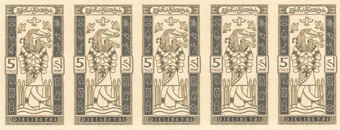 Eventually the Djelibeybi stamp was issued in shades of deep green on a pea green background, and the size had increased again to 60 x 32 mm. There was a reversed border sport and a reversed birds sport included on the sheet, which housed 24 stamps in two panels with a central gutter.