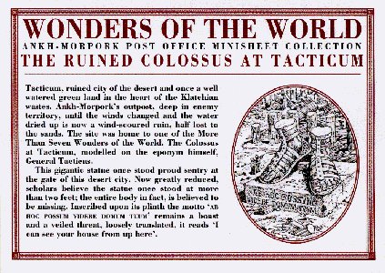 A pair of the Wonders of Discworld mini-sheet collection feature wonders associated with Klatch, so this seems to be the best place for them in the absence of a dedicated minisheet page. The Colossus of Tactiturn and The Light Wells are both in the Klatchian desert. Read about them on the accompanying explanatory inserts.