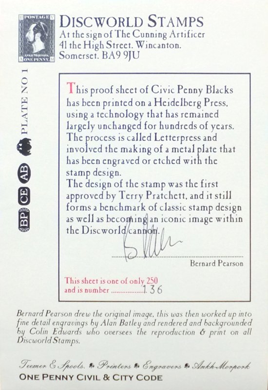 This stamp is a bit of a curio. A Penny Patrician printed by letterpress, a centuries old technique. According to the Wincanton news release in April 2005 – “Recognisable because the paper is thinner (80 gsm) than the normal Penny’s , and the printing process is one we have never used before. The other difference is in the letters in the corner cartouches of the stamps, which bear the letters H-V & A-M The stamps have been produced on a very old Heidelberg letterpress. The letters or plate are clamped into a frame, a printing form supplies the ink before this is covered with the sheet and “pressed” on to produce a ready-printed sheet which can be reproduced indefinitely. It’s an old and tried process, which gives the stamps a unique, slightly antique look. The plates are of zinc, and therefore do wear out quickly, so we are only doing the one print run. Of the 350 sheets (of 56 stamps) produced, 250 were made available to subscribers of the Stanley Howler Stamp Journal for £30.00 and came in a special acid free folder and with a individual numbered letter of authenticity. The remainder were perforated at Wincanton and split up to be released in LBEs. Unlike all the other Penny Patricians except the Enschede this stamp has a different paper and gum. It appears a bit yellower from the back and lacks the roughness of the gum. This process results in a very monochrome stamp, with only black ink being used. This result is certainly rather in keeping with Ankh-Morpork technology, but out of step with all the other stamps!. There is a sport of this stamp. One stamp per sheet has the V in the top left cartouche sloping to the right.