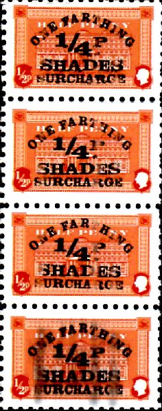 The stamps were printed in their own special sheets of 55, five wide and eleven deep. This seems an odd arrangement when they were supposed to be offered in blocks or strips of four. It states ‘These halfpenny stamps supplied with the overprint of a farthing surcharge for deliveries to The Shades’. You should be able to identify the position of your stamps on the sheet from the pattern of the overprint. I reckon the block above came from rows 5 and 6 columns 1 and 2. The strip seems to be column 3, rows 1 to 4.