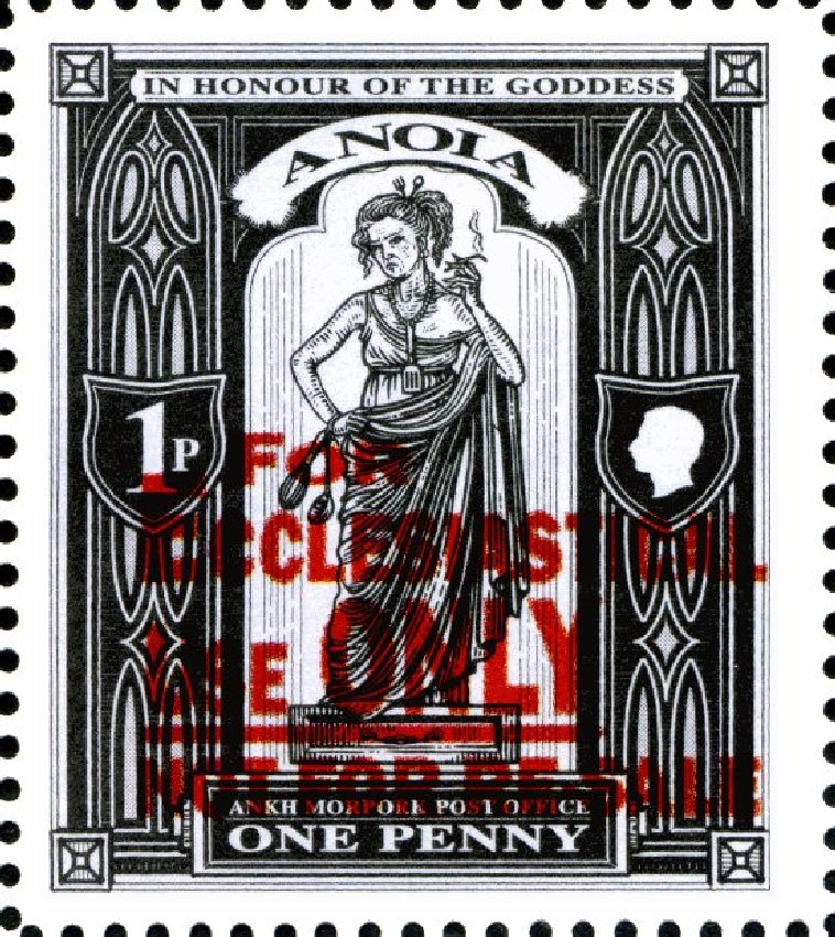 A series of covers were inspired by a section in Making Money, when Moist has been summoned to Vetinari’s office and wrongly assumes that it is due to damage to some of the mail by snails. In order to control the toads that were supposed to remove the snails, snakes were introduced into the post boxes “We got carried away', said Moist. 'We were a bit too creative in our thinking. We encouraged mongooses to breed in the posting boxes to keep down the snakes ....' Lord Vetinari said nothing. 'er ... which, admittedly, we introduced into the posting boxes to reduce the number of toads ....' Lord Vetinari repeated himself. 'Er ,, which, it's true, staff put in the posting boxes to keep down the snails ..' Lord Vetinari remained unvocal. 'Er ..... These, I must in fairness point out, go into the boxes of their own accord, in order to eat the glue on the stamps,' said Moist, aware he was beginning to burble. These covers were available only through the GCTS scheme and were quite limited; limited to 70 in the case of the Snake Venom cover which used the One Penny Anoia stamps. This cover came from the United Temple of Assorted Deities, addressed to The Householder, and asking for a contribution to their coffers (un the form of unused stamps) in return for prayers to the Lesser Know Gods tailored to the donor. Blessings will then fall from the sky and enemies will be smited. The flyer inside has a One Penny Anoia stamp loosely attached for the return postage. This is the only source of the Anoia stamp overprinted with FOR ECCLESIACTICAL USE ONLY NOT FOR RESALE in red. If used for any other purpose, you are informed, you will incur both the wrath of the gods and the AMPO.