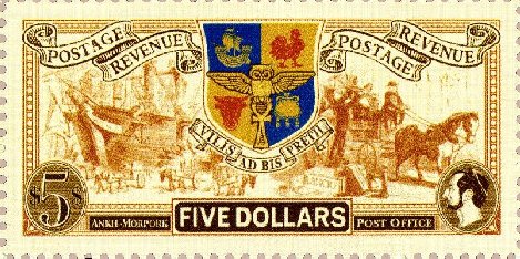 The Merchants stamps took this a bit further, especially for the $5 stamp sheets with the addition of the first fancy Teemer & Spools logo, reflecting he arms of the guild memebers featured on the stamps,
