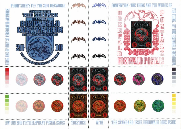 An A4 sized proof sheet with all four fifth elephant stamps (commons and sports) in perforated form was a lucky dip prize in The Convention LBE. There were just 25 to be won. What marks these stamps is the white background as opposite to the bilious yellow of the 10 Bz stamp and the flecked blue of the Convention stamp. In this form they mist be one of the rarest Discworld stamps, though I doubt anybody has split a sheet in order to display the stamps as singles or pairs. Another measure of their uniqueness is that the sports and commons were printed in equal numbers.