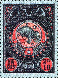 The same design was used for one of the Convention emberellas. There was a sport with the largest central star coloured red. The other stamp shows a dwarf axe against a background similar to the sheet margin design. No full sheets were available for collectors, but an imperforate sheet held in the British Library collection shows they mirrored the 10 Bz sheets. A second imperf sheet shows that a rather lurid green background was also considered.