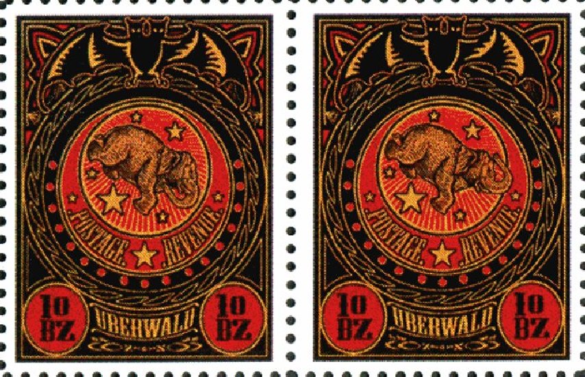 The 10 Bizot stamp features the fifth elephant of legend which is said to have crashed into the Discworld and is the source of the Schmaltzburg fat deposits. The stamps were issued in sheets of 18, the borders of which are very ornate. There is no indication of who printed the stamps. The sport stamp shows the elephant’s trunk curled upwards instead of downwards. There seems to have been more than one printing of this stamp as it exists with a bright icteric background shade of yellow, and a more muted shade.