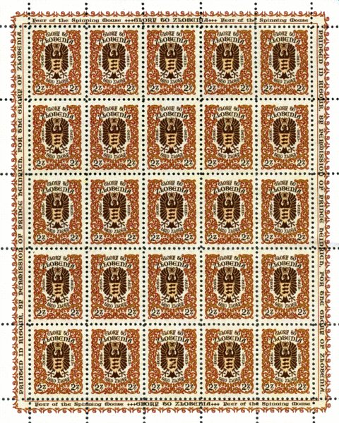 Collectors had to wait 10 years for a second proper Zlobenian stamp to appear. This was the two Zloty issued in the Year of the Spinning Mouse. The Glory To Zlobenia stamp was printed in sheets of 25 with a single sport. This had one of the clogs rather appropriately replaced by a high heeled shoe. Again Teemer and Spools were rebuffed, with the printing being performed in Rigour (by permission of Prince Heidrich).